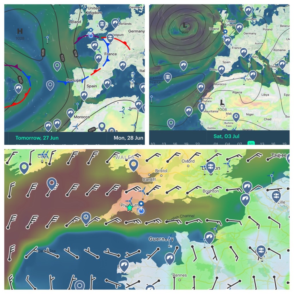 Yacht Liquid Asset is attached firmly to the pontoon in Darthaven Marina and the crew debate their first move. Covid19 rules and restrictions remain and the Channel Islands are not fully open until Thursday. Our only choice is to head West and the Isles of Scilly could be reached if the winds are favourable. So let’s visit the weather charts for next week. Mmmmm… ?