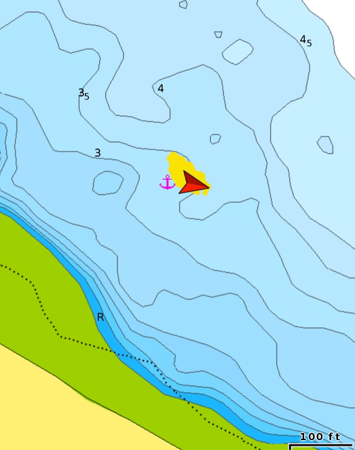 Anchor alarms were set to check our position did not move out of a predetermined ‘safety circle’. Each moment is measured with a yellow dot and plotted on the chart. We stayed in one place on the 3.5 metre contour.