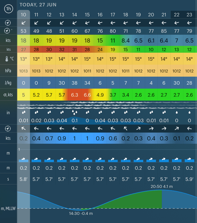 Can you remember the weather system forcasts from last Saturday? The Atlantic high pressure would be replaced with a low pressure system. Sunny days of calm to be replaced with stronger winds and rain. Should we sail today or wait for the strong winds and high waves arriving Saturday?