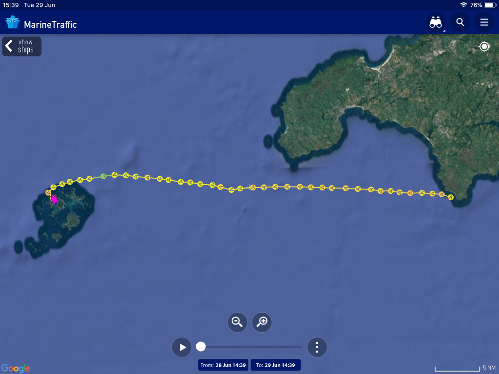 07:00 Departed from anchorage and sailed westwards with a northerly force 4 and tide against. Waypoint set for IoS and distance to waypoint DTW 42NM. Estimated passage time 7hr at 6kts or 6hr at 7kts.