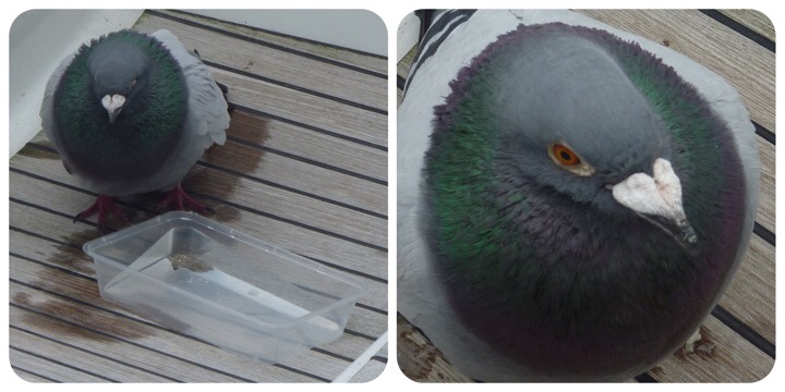 Out of nowhere, a racing pigeon landed on the back of Liquid Asset and then hopped onto the deck next to the helmsman. Exhausted and grateful of a landing spot, it decided to find a place to rest and remained our companion until we reached land. Water and refreshments were provided and thankfully received. Parting gifts were washed away with a bucket of seawater
