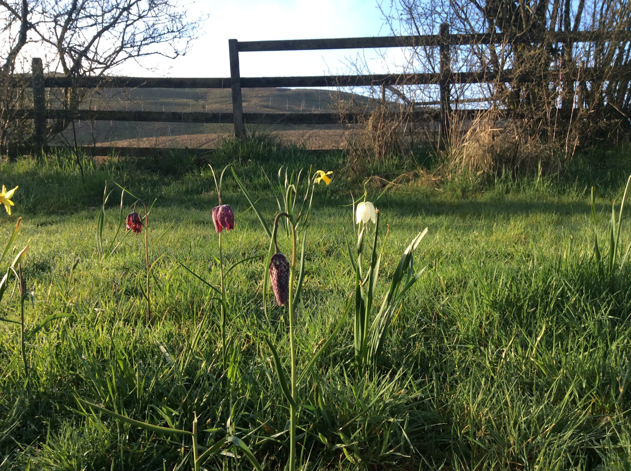 Spring flowering begins with snowdrops followed by daffodils, tulips, snakes head fritillary and cowslips.