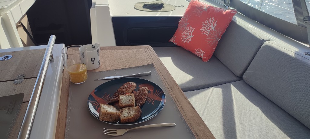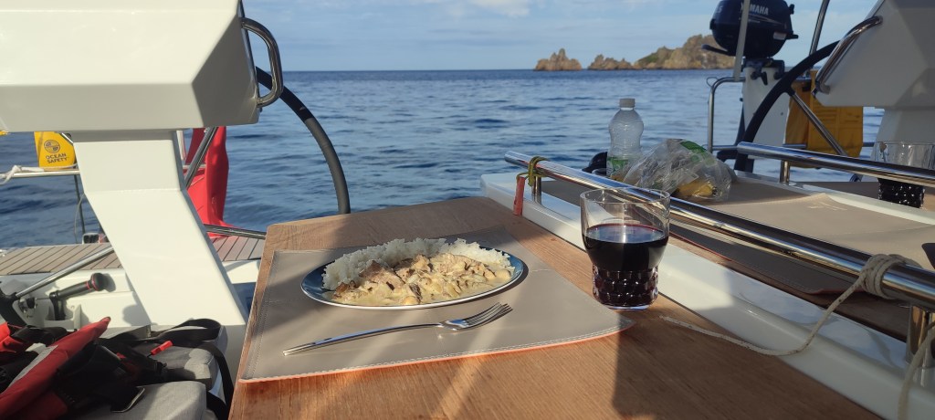 After a fine meal on deck and listening to music we heard shouting in the distance again and again. Our dinghy had slipped its knot and was floating away towards the shore. Without delay our dinner table was cleared, navigation screens on, engine on and anchor raised. With all the shouting, everyone was out to see the show.