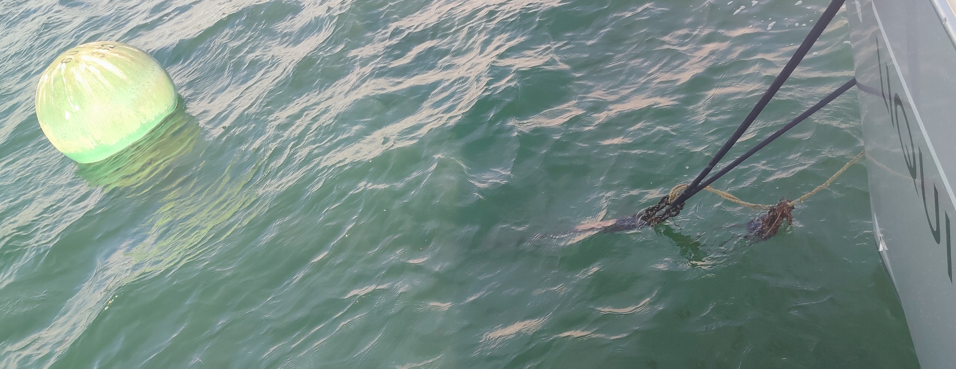 The Voose Bay anchorage is a sheltered spot near the entrance to the ria. It tends to be crowded and rolly. We passed the cardinal buoy. Can you identify it?