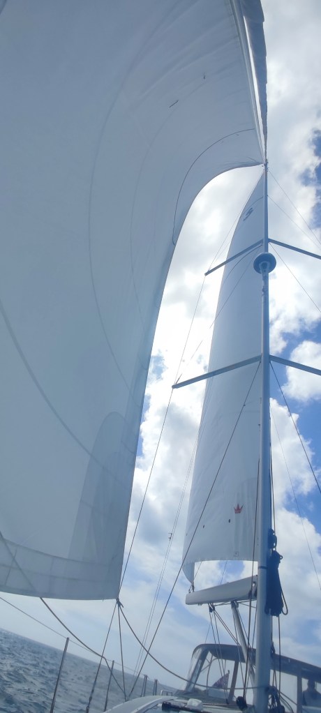 11:30 Out at sea, we spent a joyous time sailing back and forth just for fun. We were not alone; there were about 50 others like-minded. Plenty of open seas and fair winds, tacking and gybing on a whim.