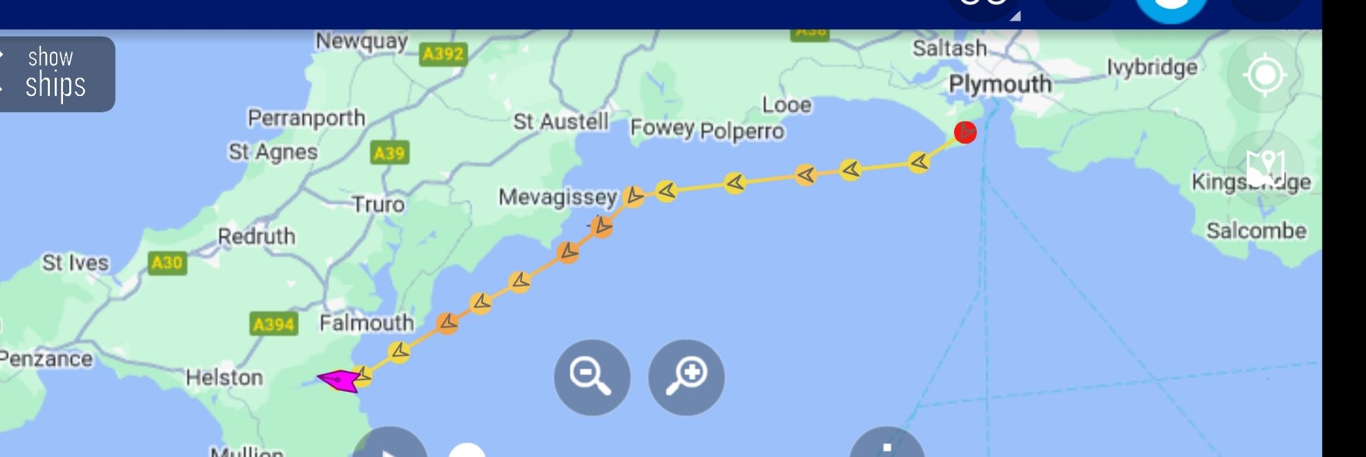 Change of course towards the River Helford missing Dodman Point. Our new course did cross over rocky shallows called the Field and the Bellows but with plenty of water to spare. Popular with fishing boats.