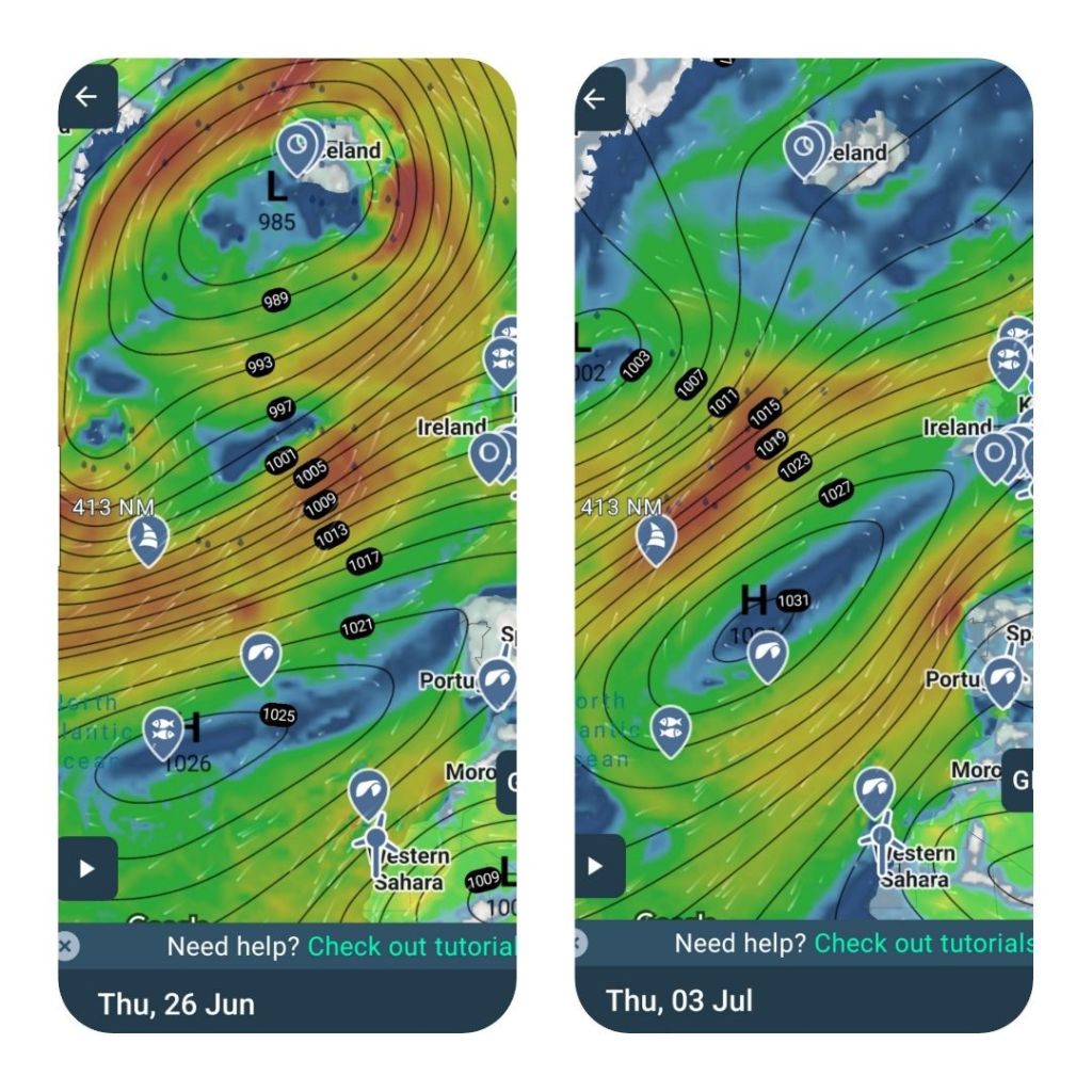 The forecast for wind speed and direction is set, and today the centre of the low sits over Iceland. The wind direction is westerly, and its speed is Beaufort force 4. Next week, the Azores high-pressure system moves towards the UK and the wind direction changes.